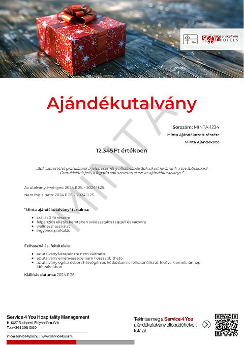 - A címletes értékutalvány bármely Service 4 You szállodában felhasználható.