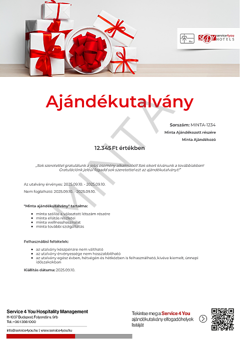 - A címletes értékutalvány bármely Service 4 You szállodában felhasználható.